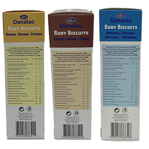 Danalac Baby Biscuits (120g x 6) Combo Snack Pack - 2 Banana, 2 Cocoa, 2 Natural Plain - Snacks and Food for Toddlers 6+ Months with Calcium, Iron and Vitamins